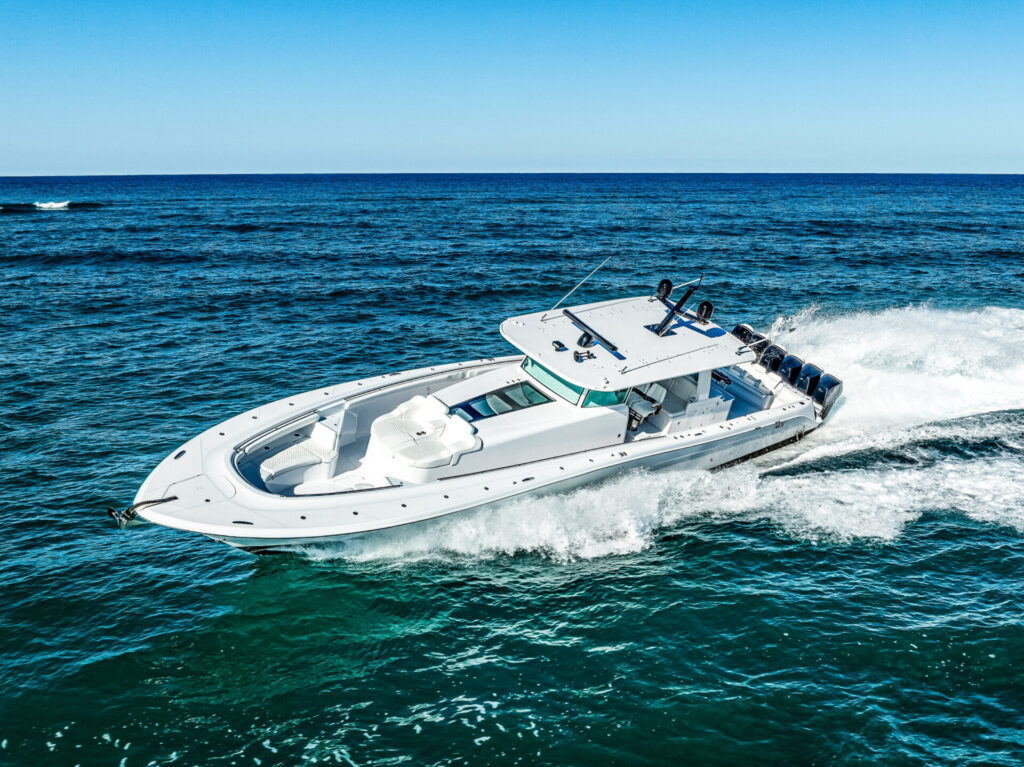 The 39′ Speciale is the gateway to the brand while keeping the same standards found across the fleet. Triple outboards give crisp handling and an easy driving experience, even for new owners moving up. The size is more manageable in marinas yet still feels substantial offshore. Pricing varies with power and options but often sits at the most accessible point within HCB yachts. You still get the brand’s signature ride, materials, and systems throughout.
