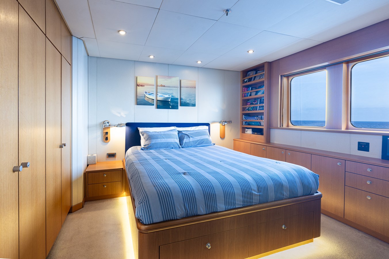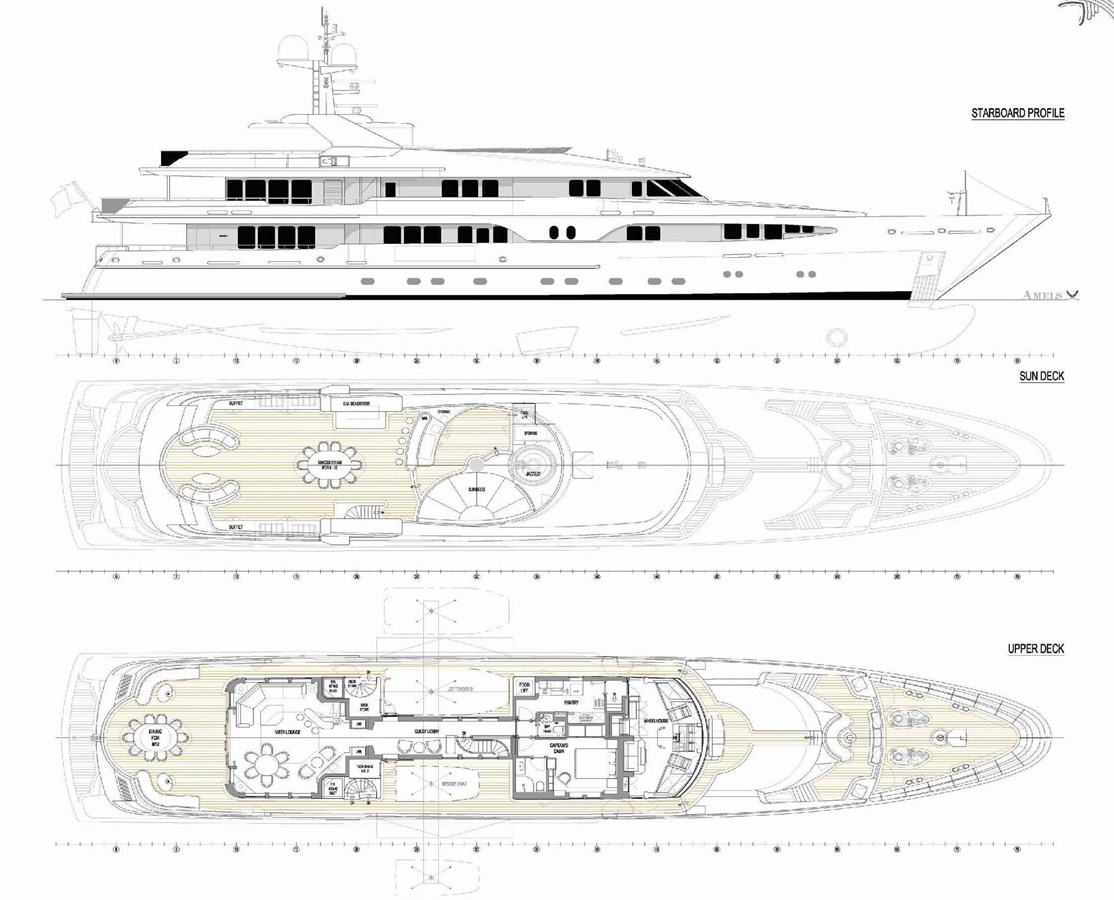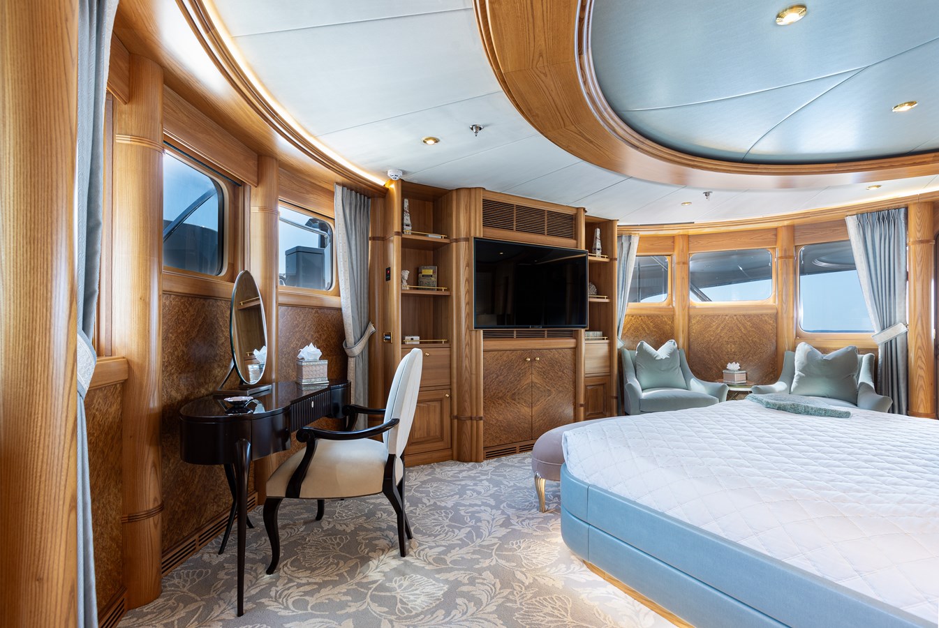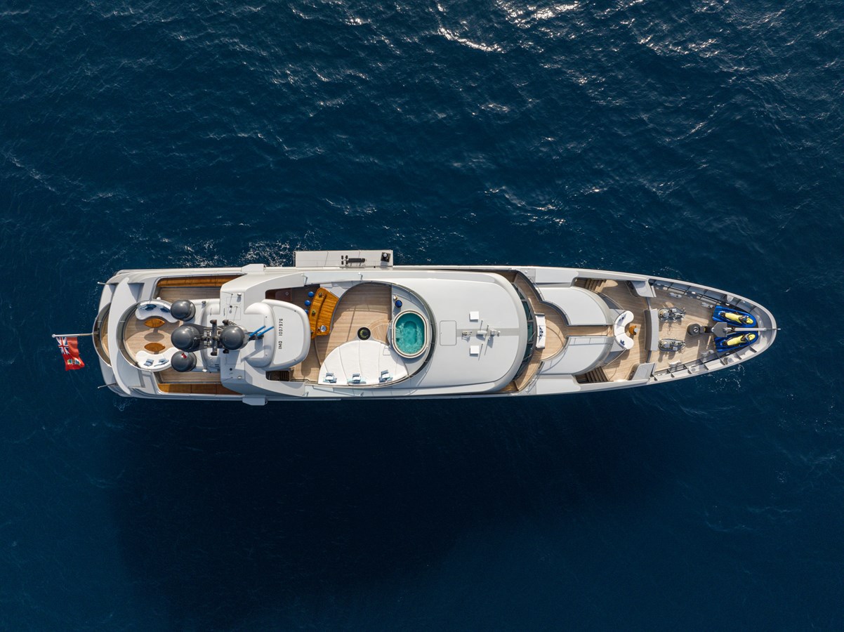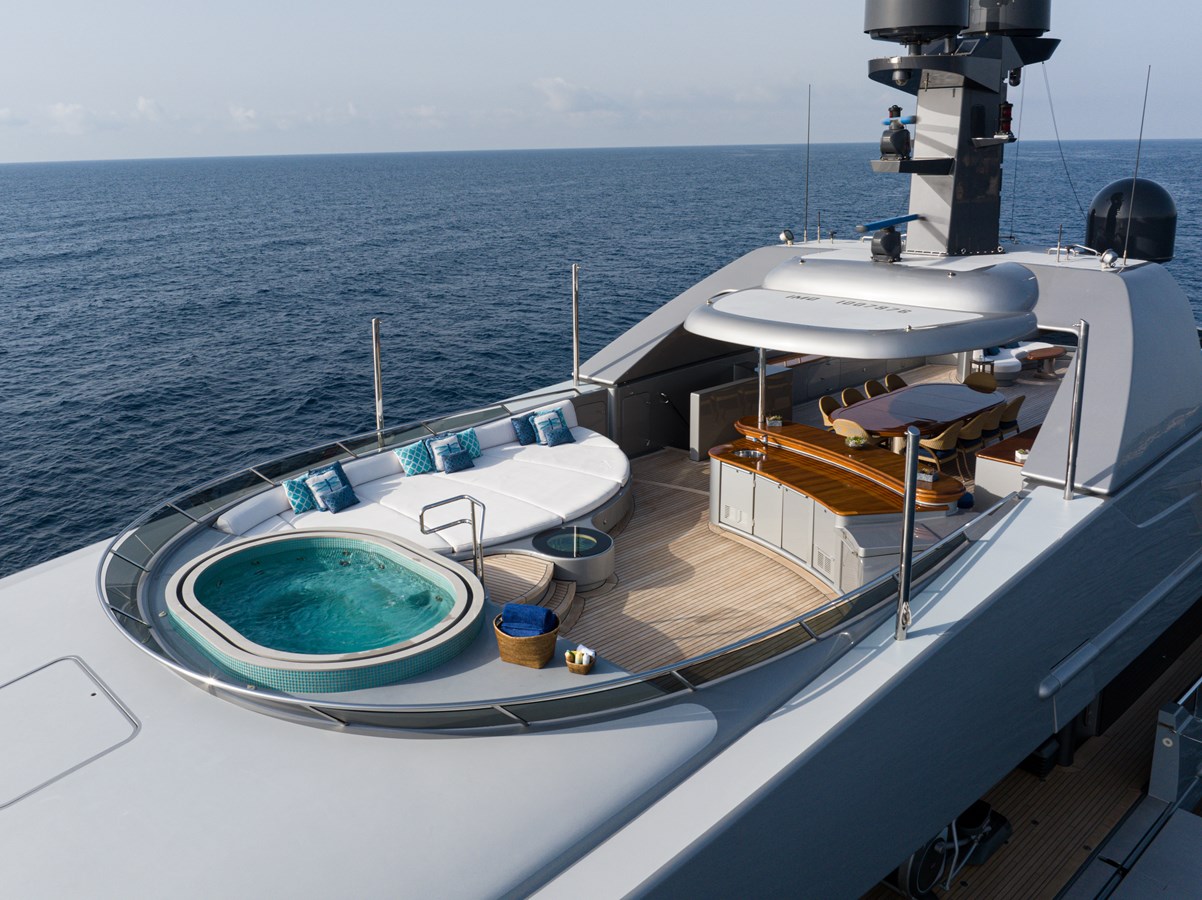The spacious master cabin has its own private interior lounge and exterior seating via private entrance. Tenders are stowed on bridge deck mid-ship out of the way from guest spaces. With a full displacement hull and a large gross tonnage of 659 tonnes, she extremely comfortable and quiet underway.